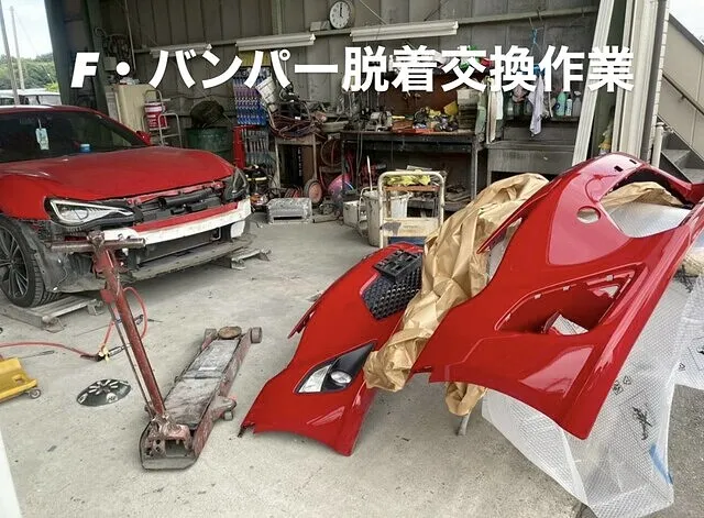 フロントバンパーフェイスは交換 右フロントフェンダーは板金塗装で保険会社と協定となりました。4枚目の写真が フロントバンパーフェイス交換作業になります。